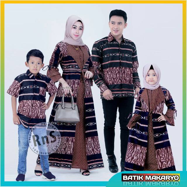 Model : Couple Batik Keluarga yang terdiri dari gamis ibu,gamis anak, kemeja lengan pendek anak, dan kemeja lengan panjang ayah.
